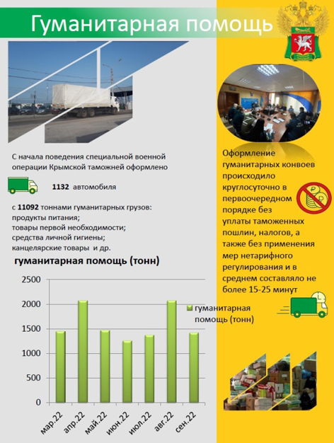 В сентябре 2022 года сотрудниками Крымской таможни оформлено более 1,4 тысячи тонн гуманитарных грузов. Всего с начала поведения специальной операции Российской Федерации таможней оформлено 1132 транспортных средства, в которых находилось свыше 11 тысяч тонн гуманитарной помощи. Это продукты питания, товары первой необходимости, средства личной гигиены, канцелярские товары и другие, которые направлялись мирным жителям Херсонской и Запорожской областей.