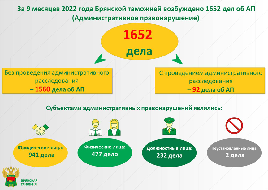 Снижение количества дел об АП более чем на 10% обусловлено рядом объективных причин, в том числе приостановлением авиационного сообщения в крупных международных аэропортах (так, количество дел об АП, возбужденных на таможенных постах Аэропорт Краснодар и Аэропорт Ростов-на-Дону (Платов), сократилось на 729 дел, с 958 до 229 дел), а также изменениями, внесенными в действующее законодательство Российской Федерации, в частности неприменение специальных экономических мер и количественных ограничений экспорта и импорта на территории ДНР и ЛНР или с таких территорий.