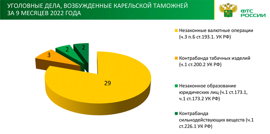 Выявляются нарушения таможенного законодательства и преступления в таможенной сфере. За 9 месяцев 2022 года возбуждено более 2,6 тыс. дел об административных правонарушениях (недостоверное декларирование товаров, нарушения при подаче статотчетности при торговле со странами ЕАЭС, нарушения валютного законодательства).