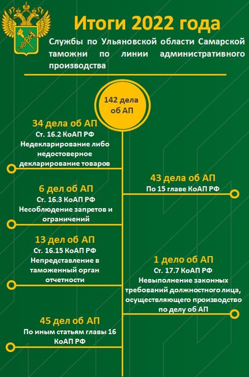 Всего после выпуска товаров было доначислено более 273 млн рублей. При этом за 11 месяцев 2022 года зарегистрировано 1 525 дел об административных правонарушениях, общая сумма назначенных наказаний — 307 млн рублей. За этот же срок было возбуждено 16 уголовных дел, связанных с уклонением от уплаты таможенных платежей и исполнения обязанностей по репатриации валюты, по фактам незаконного образования юрлиц, незаконного перемещения через границу наркотиков.