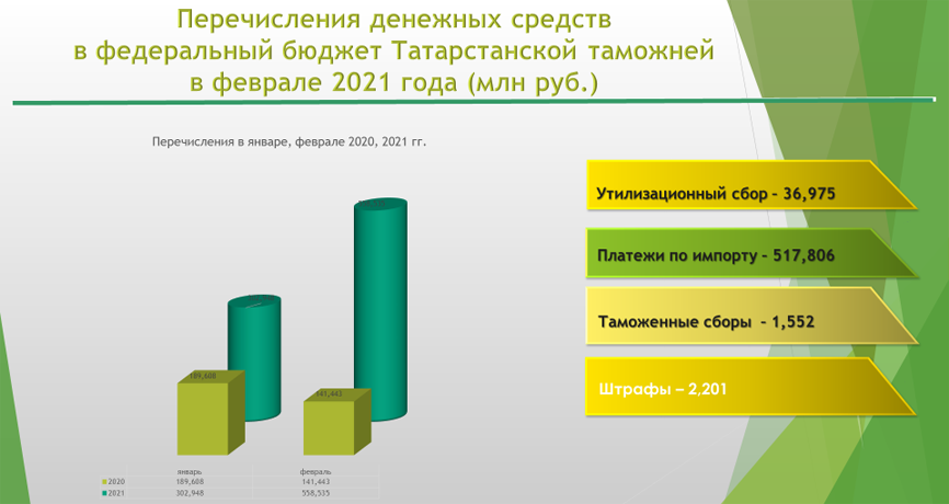 По итогам 2020 года сумма доходов федерального бюджета, администрируемых таможенными органами, составила 4 751,8 млрд руб., в т.ч. 3 444 млрд руб. при импорте и 1 148,1 млрд руб. при экспорте товаров.