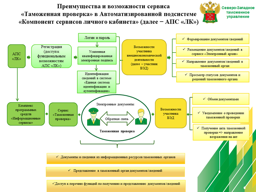 Информационный сервис «Таможенная проверка» из автоматизированной подсистемы «Личный кабинет участника ВЭД» позволяет осуществлять обмен между таможенным органом и лицом, в отношении которого проводится таможенный контроль после выпуска товаров, документами и сведениями в электронном виде при проведении таможенной проверки. Благодаря этому снижается нагрузка на проверяемое лицо в части исключения необходимости направления в таможенные органы документов и сведений в ходе и по результатам таможенной проверки, что существенно сокращает время обмена информацией.