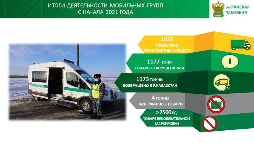 Мобильные группы Алтайской таможни осуществляют контроль за ввозом товаров в регионе деятельности Алтайской таможни на российско-казахстанском участке государственной границы, протяженностью порядка 860 км. С начала 2021 года ими проверено 1025 транспортных средств, выявлено 1177 тонн товаров с нарушениями. Из них 1173 тонны товаров возвращено в Республику Казахстан из-за отсутствия соответствующих документов, необходимых при ввозе на территорию Российской Федерации, а 4 тонны товаров задержано. В ходе проводимых мероприятий сотрудниками мобильных групп Алтайской таможни выявлено более 2500 единиц продукции без обязательной маркировки.