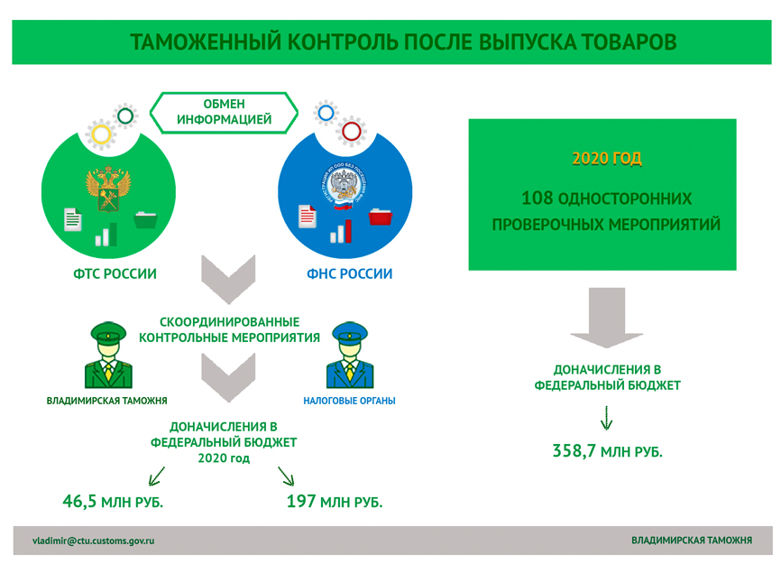 Межведомственный обмен информацией Владимирской таможни и налоговых органов Владимирской, Ивановской, Ярославской и Костромской областей позволил выявить признаки нарушений таможенного и налогового законодательства у шести предприятий и организаций. В результате такого взаимодействия в федеральный бюджет в 2020 году таможней доначислено 46,5 млн рублей, налоговыми органами - 197 млн рублей.