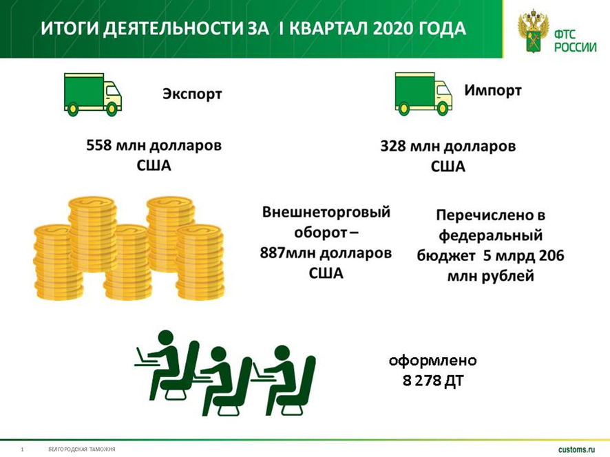В 1 квартале 2020 года с Владимирской таможней работали 1337 предприятий, организаций и физических лиц (в 2019 – 1002). Из них 18% зарегистрированы во Владимирской области, 13% в Ивановской области, остальные – в иных регионах Российской Федерации. В федеральный бюджет перечислено 10,3 миллиарда рублей, в аналогичном периоде 2019 года - около 7 миллиардов рублей.