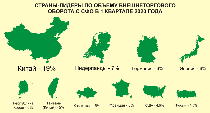 По сравнению с 1 кварталом 2019 года товарооборот СФО с Китаем уменьшился на 12,5%, с Нидерландами – на 40,9%, с Германией – на 36,2%, с Польшей – на 34,2%, с Республикой Корея – на 25,7%, с Японией – на 20,9%, с Тайванем – на 3,8%. При этом в торговле с Францией внешнеторговый оборот вырос в 2,7 раза, с Турцией – на 42,0%, с США – на 28,4%, с Казахстаном – на 3,2%.