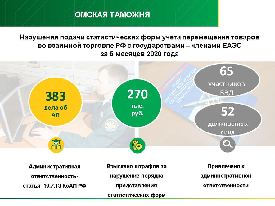 Эта технология позволяет экономить время и ресурсы, снижает риск нарушения установленных Постановлением Правительства сроков представления статформ, что рассматривается как административное правонарушение. Ответственность за такое правонарушение, равно как и за непредставление статистических форм или за указание в них недостоверных сведений, предусматривается статьёй 19.7.13 КоАП России. Особенно строго наказываются случаи повторных нарушений, штрафные санкции могут превышать 50 тысяч рублей за каждое правонарушение. За 5 месяцев 2020 года Ярославской таможней возбуждено 200 административных дел этой категории, начислено административных штрафов на сумму 1 млн. 170 тыс. рублей.