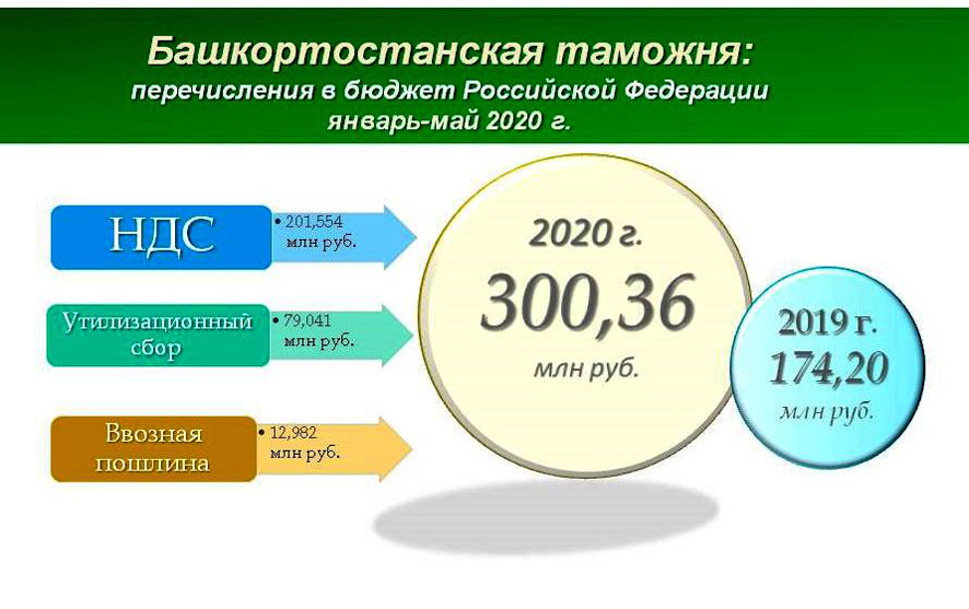 В мае 2020 года Татарстанская таможня направила в федеральный бюджет 173 млн 576 тыс. руб. Из них платежи по импорту составили 102 млн 650 тыс. руб., таможенные сборы – 1млн 37 тыс. руб., утилизационные сборы – 69 млн 493 тыс. руб. штрафы –394 тыс. руб., прочие неналоговые доходы – 2 тыс.руб.
