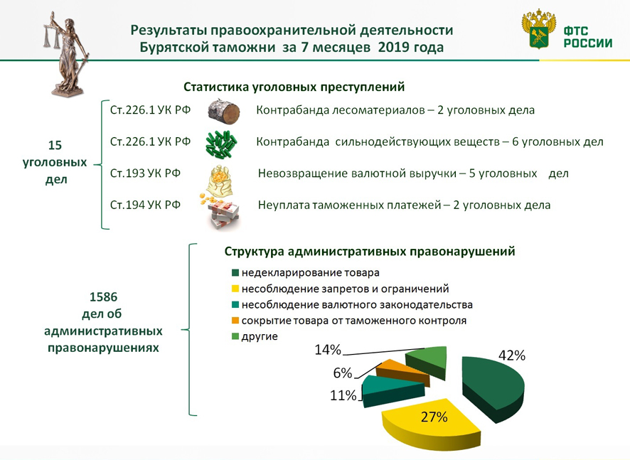 Также в первом полугодии 2019 года по факту невозврата денежных средств из-за рубежа за вывезенный товар отделением дознания Иркутской таможней было возбуждено 9 уголовных дел (по ст. 193 УК РФ) на общую сумму свыше 449,6 млн рублей.