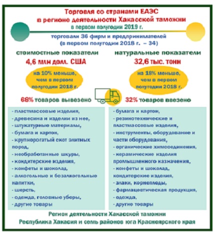В первом полугодии 2019 года мобильные группы таможен Сибири возвратили в Казахстан около 18,7 тысяч тонн товаров, ввезённых в Россию с нарушением требований действующего законодательства. Объём возвращенных товарных партий по сравнению с аналогичным периодом прошлого года вырос на 61%.