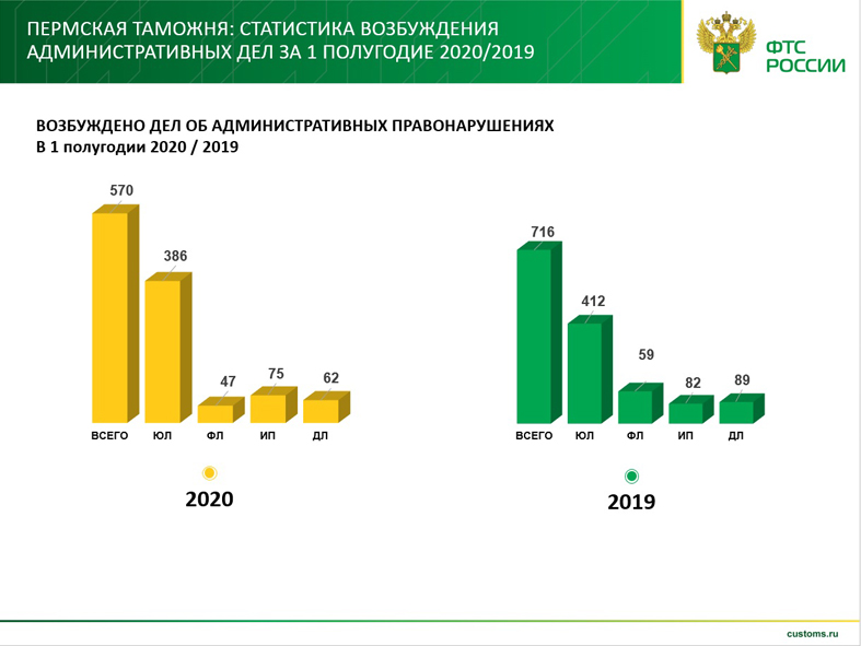 Уменьшилось количество дел об АП, возбужденных по 16 главе КоАП РФ (нарушения таможенных правил), так в 1 полугодии 2019 года было возбуждено 190 дел, в 1 полугодии 2020 года - 108. Снижение связано с отсутствием международных рейсов в зоне деятельности таможенного поста Аэропорт Пермь Пермской таможни.