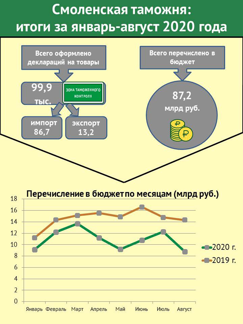С января по август 2020 года Смоленская таможня перечислила в федеральный бюджет 87,2 млрд рублей. За данный период оформлено 99,9 тыс. деклараций на товары (ДТ), в т.ч. 13,2 тыс. ДТ - по экспорту.