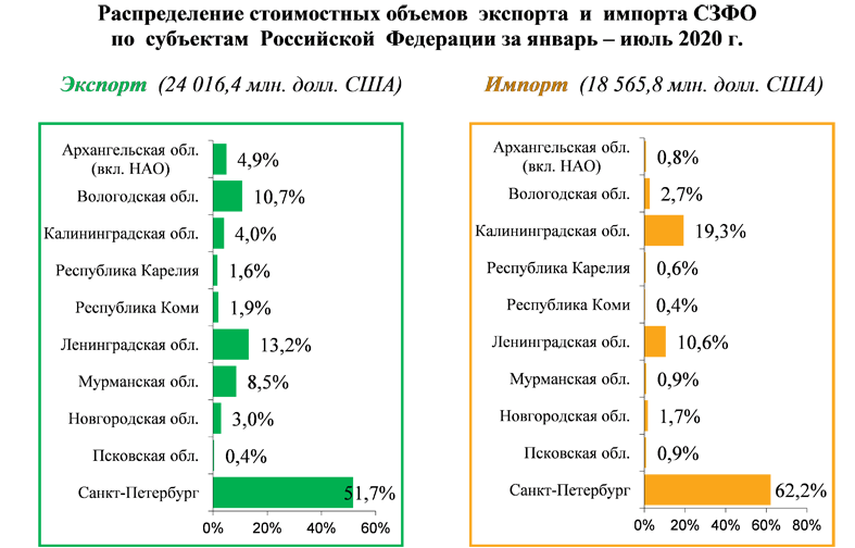 В распределении экспорта по субъектам Российской Федерации, входящим в СЗФО, лидируют Санкт-Петербург (51,7%), Ленинградская область (13,2%), Вологодская область (10,7%). Первое место в импорте занимает Санкт-Петербург (62,2%), второе место – Калининградская область (19,3%), третье место – Ленинградская область (10,6%).