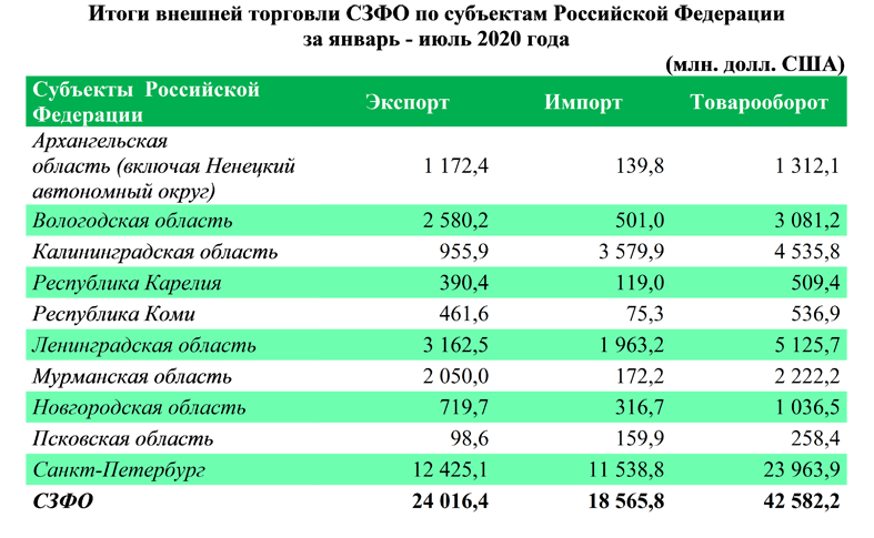 Внешнеторговый оборот СЗФО за январь - июль 2020 года составил 42 млрд 582 млн долларов США.
