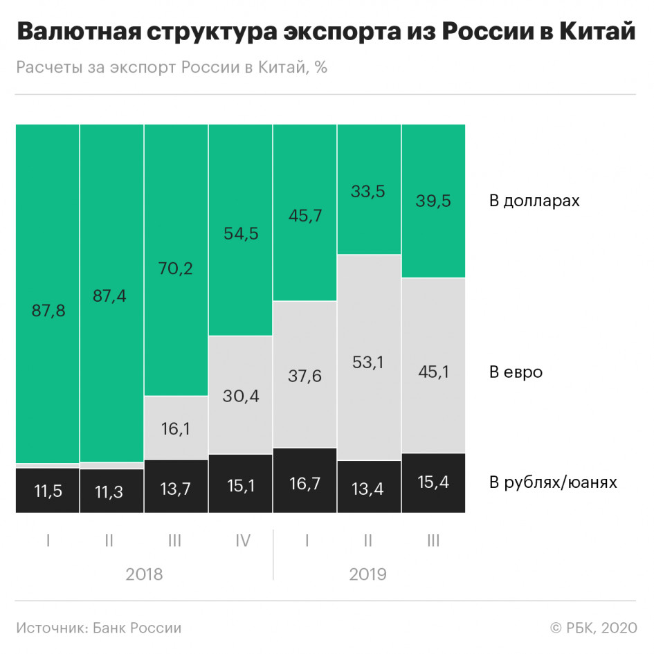 Еще в начале 2018 года российские экспортеры в Китай получали почти 88% выручки в долларах и лишь 0,7% в евро. Спустя полтора года евровалюта уже опередила доллар — 53,1 против 33,5%.