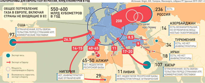 Единственные две страны, которые обладают достаточной ресурсной базой и не связаны обязательствами по экспорту газа, способные заместить российские поставки в Европу, - это Иран (вторая в мире после России страна по запасам газа) и Туркмения (5-е место в мире). Но у обеих стран нет транспортной инфраструктуры для поставок в Европу, средств и возможностей для ее создания. Иран к тому же еще и находится под санкциями США.