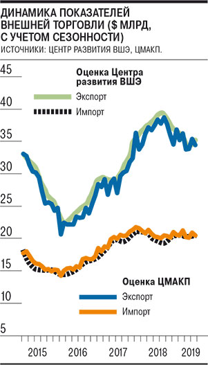 По данным регулярного доклада Центра развития Высшей школы экономики о помесячной динамике внешней торговли товарами с сезонной корректировкой, в августе продолжился вернувшийся в РФ в июле 2019 года (после спада в течение ноября 2018 — июня 2019 года) рост экспорта. Основные его источники — увеличение физических поставок за рубеж сырой нефти, пшеницы и меслина (см. «Сегодняшнее число») на фоне «хронического многомесячного снижения экспорта нефтепродуктов, необработанных лесоматериалов и древесной целлюлозы». В результате, исходя из оценок Центра развития, в июле—августе наметился разворот тенденции падения экспорта товаров: за два месяца (август относительно июня 2019 года) он вырос на 1,7%, импорт же увеличился лишь на 0,6% (активно рос ввоз стальных труб, лекарств и легковых автомобилей) — сальдо торгового баланса выросло, соответственно, на 3,1%. Впрочем, по оценкам ЦМАКП (также с учетом сезонности), экспорт товаров после отскока в июле в августе 2019 года снова снизился, как и импорт,— денежные объемы последнего полтора года практически не меняются, колеблясь около $20 млрд в месяц (см. график).