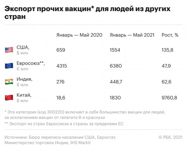 Как уточнили РБК в Министерстве промышленности и торговли, экспорт вакцин для профилактики новой коронавирусной инфекции также идет под этим кодом: «Безусловно, рост объемов экспорта продукции [под этим кодом] связан прежде всего с осуществлением поставок противоковидных вакцин на международные рынки». В пресс-службе ФТС не смогли уточнить распределение объемов экспорта по типам вакцин, сославшись на то, что в торговой номенклатуре не выделены отдельные коды для классификации вакцин для людей в соответствии с их наименованиями. «Корректное определение доли вакцин от новой коронавирусной инфекции не представляется возможным», — сообщили в службе.
