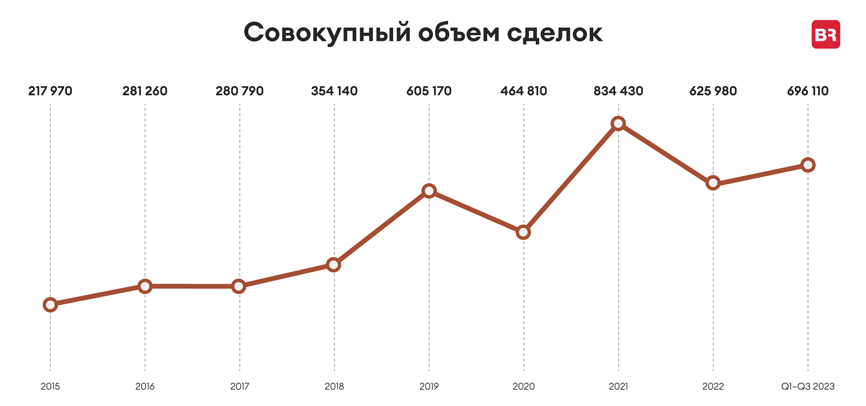 Санкт-Петербурга по итогам 1-3 кварталов 2023 года составил 696 110 кв. м,