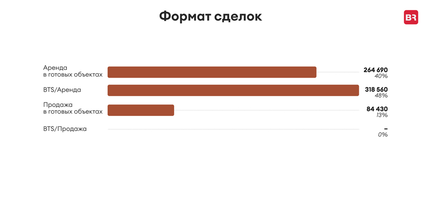 Для сравнения, по итогам 2022 года доля сделок аренды BTS составляла 34% (против 51% в готовых складах), в абсолютном выражении площадь таких сделок составляла 139 310 кв. м. Увеличение доли сделок аренды по модели BTS объясняется дефицитом готового предложения.
