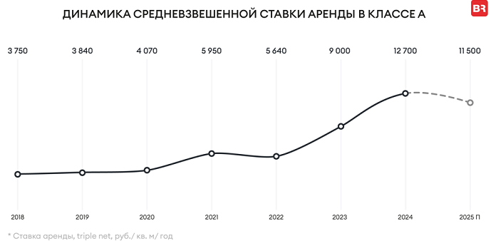 В строящихся объектах, планируемых к вводу до конца года, выставлено на продажу 1,9 млн кв. м. Аналитики прогнозируют, что до конца 2025 года объем сделок не превысит 2,5 млн кв. м, что означает снижение на 20% по сравнению с предыдущим годом. С учетом новых площадей ожидается дальнейший рост уровня вакантности до 4,5%.
