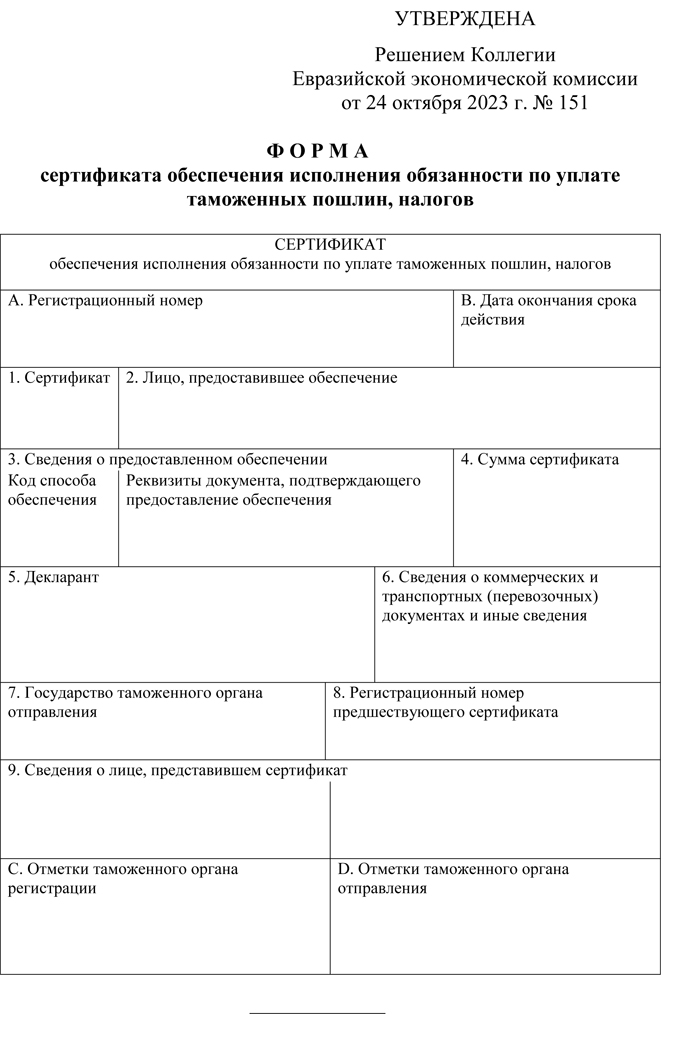 Решение № 151 от 24-10-23, О сертификате обеспечения исполнения обязанности по уплате таможенных пошлин, налогов