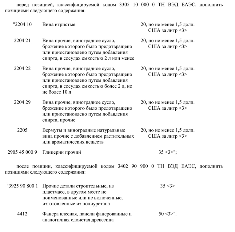 в) в ставках ввозных таможенных пошлин в отношении отдельных товаров, страной происхождения которых являются государства и территории, предпринимающие меры, которые нарушают экономические интересы Российской Федерации, утвержденных указанным постановлением: